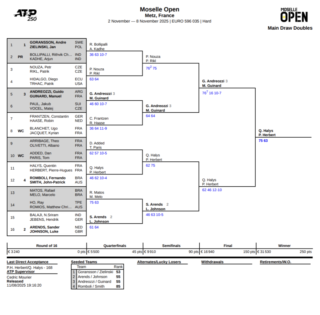 Ci-dessous respectivement le tableau des simples, des qualifications et des doubles.